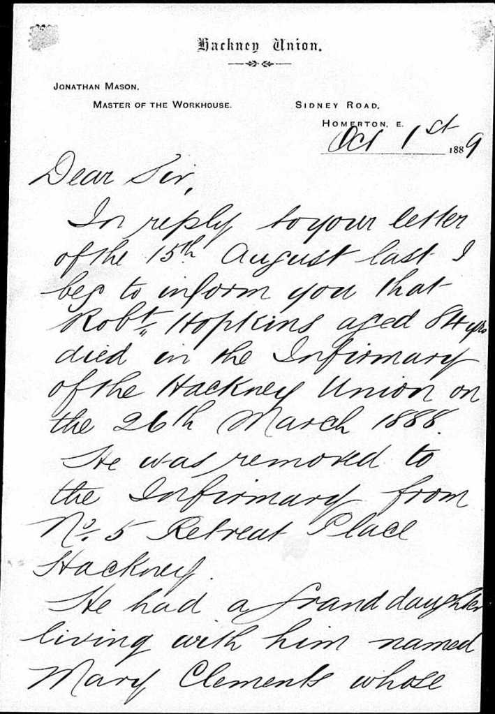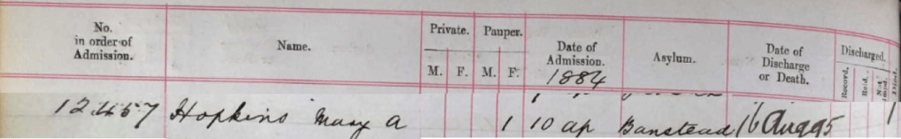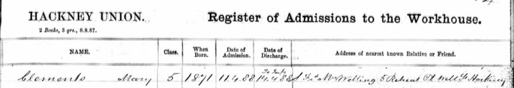 Robert’s death in 1888 in the Hackney Union Workhouse Infirmary leaves Hannah’s daughter Luzia Mary Clements without family support as she had been living with Robert prior to this. Mary continues to be admitted and discharged from the Hackney Workhouse for many years following Robert’s death, but then she disappears from records. Six years after Robert’s death, Hannah dies at Banstead.