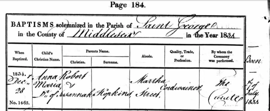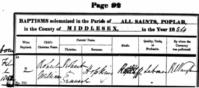 Born in 1834 Shadwell, England, by sixteen Hannah got pregnant out-of-wedlock. Her parents baptized her child Robert William Hopkins when he was about a year and a half old, less than one month before they immigrated to the United States.