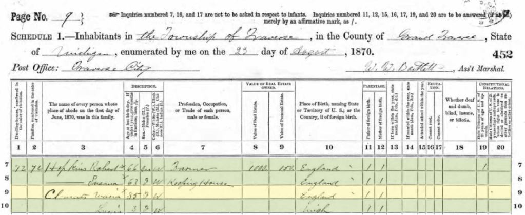 Additionally, during Hannah’s short marriage, her father requests the Grand Traverse County Probate Court to make him her illegitimate son William’s guardian. In his statement Robert provides insights into Hannah and her son’s story back in England. As a result, Robert is made guardian of his grandson by the court. Nevertheless, in less than two years Robert requests the court to void his guardianship due to his grandson leaving Robert’s home and marrying without his consent.