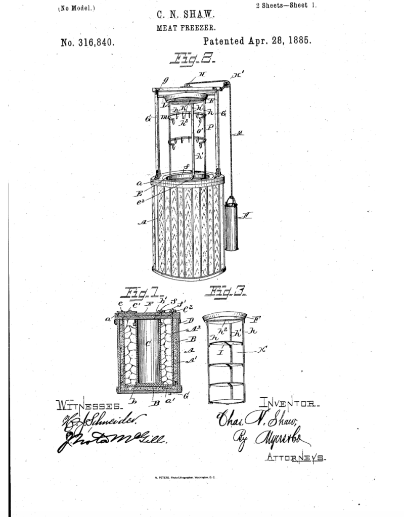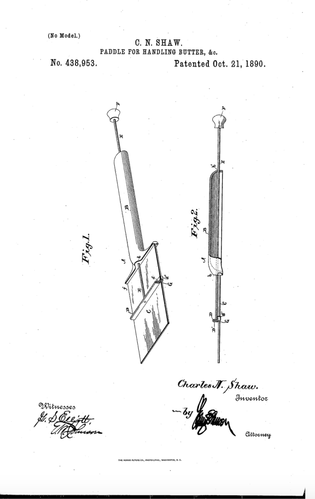 Charles Nahum Shaw was also an inventor and he held patents for several food related apparatuses pictured below. In 1885 at the age of 49 he had a patent granted for an ingenious meat freezer. A patent granted in 1890 was for a paddle for handling butter. Another 1890 patent was for an ingenious scoop. A patent granted in 1891 was for a butter cutter.
