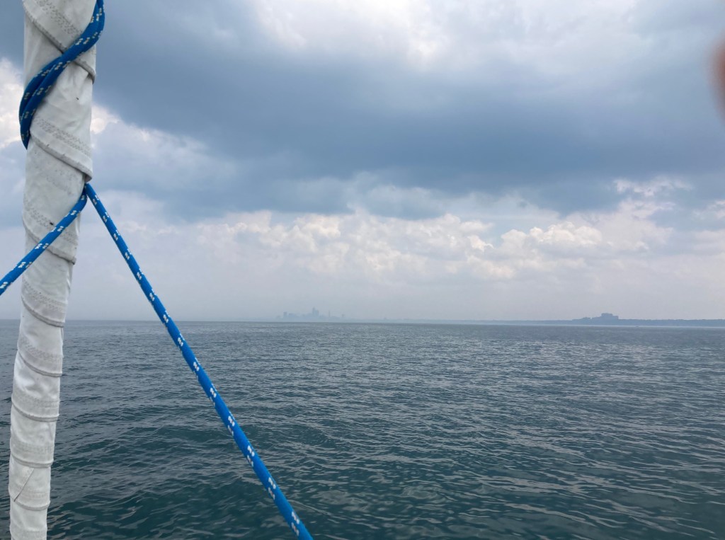 On to Cleveland. On the way a storm of blackflies moved into the cockpit keeping things lively. Then, right in front of Cleveland, we were hit by a storm of a different sort, a sudden squall with zero visibility fog and blinding rain. We turned on the radar and circled slowly several hundred yards in front of the downtown breakwater, as did several other boats. The storm lifted in 10 minutes and we made our way to the city municipal marina.