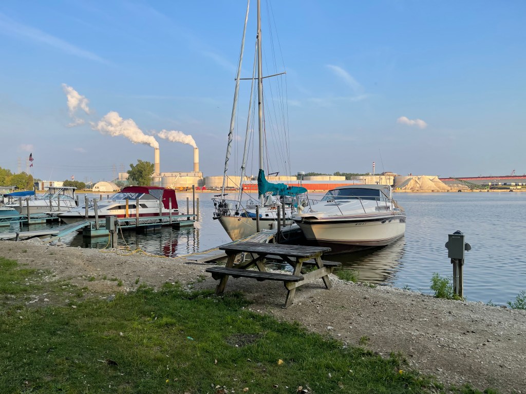 Requiring an approach in the dark through a narrow channel cutting through shallows we located the entry with the help of our chartplotter. Guiding the boat between the lighted red and green channel markers we aimed at the flashing white light far off between the colored lights. Finally we entered a small harbor that is nestled next to a large DTE power plant. Huge swarms of mayflies surrounded the light of the street lamps in the powerplant area. After some searching in yet more shallow water we located an empty slip with the aid of our spotlight and docked at the short slip for the night.