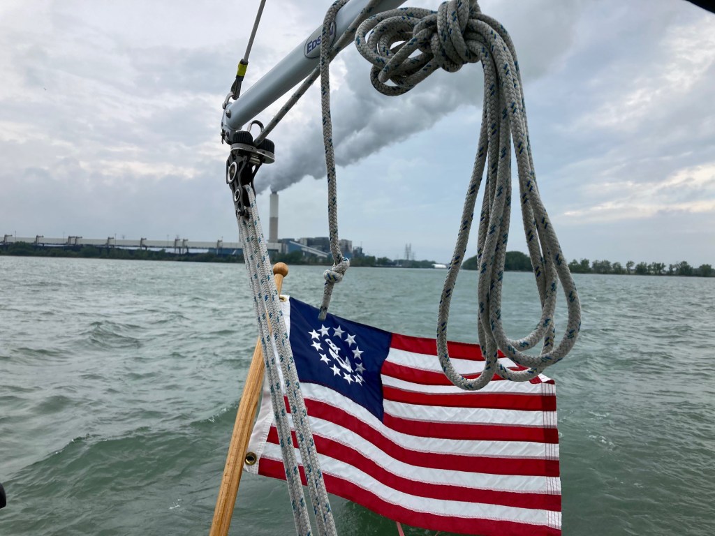We abandoned trying to dock in Detroit. We then hoped to drop anchor outside of the city but the area was too industrial and so we continued into the Detroit River. This section of the trip required much awareness of the shallow depths surrounding the main channels of the river. Our draft of about five feet frequently exceeded the depth at the edges of the narrow channel we traveled.
