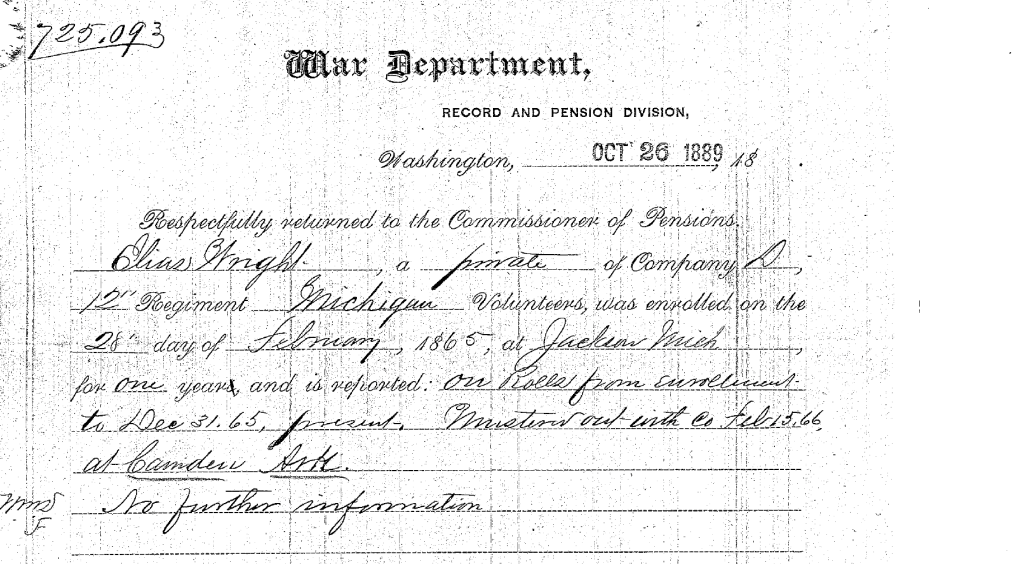 Elias Wright was another elusive family member in my Civil War research. I knew from my inquiry into Datus Wright’s Civil War service that Datus was in Michigan’s 12th Infantry Company D. I noted that there was also an Elias Wright in Michigan’s 12th Infantry Company D. Not sure if I had the correct Elias Wright, I requested the pension file for a possible match, a soldier listed as residing in Missouri.