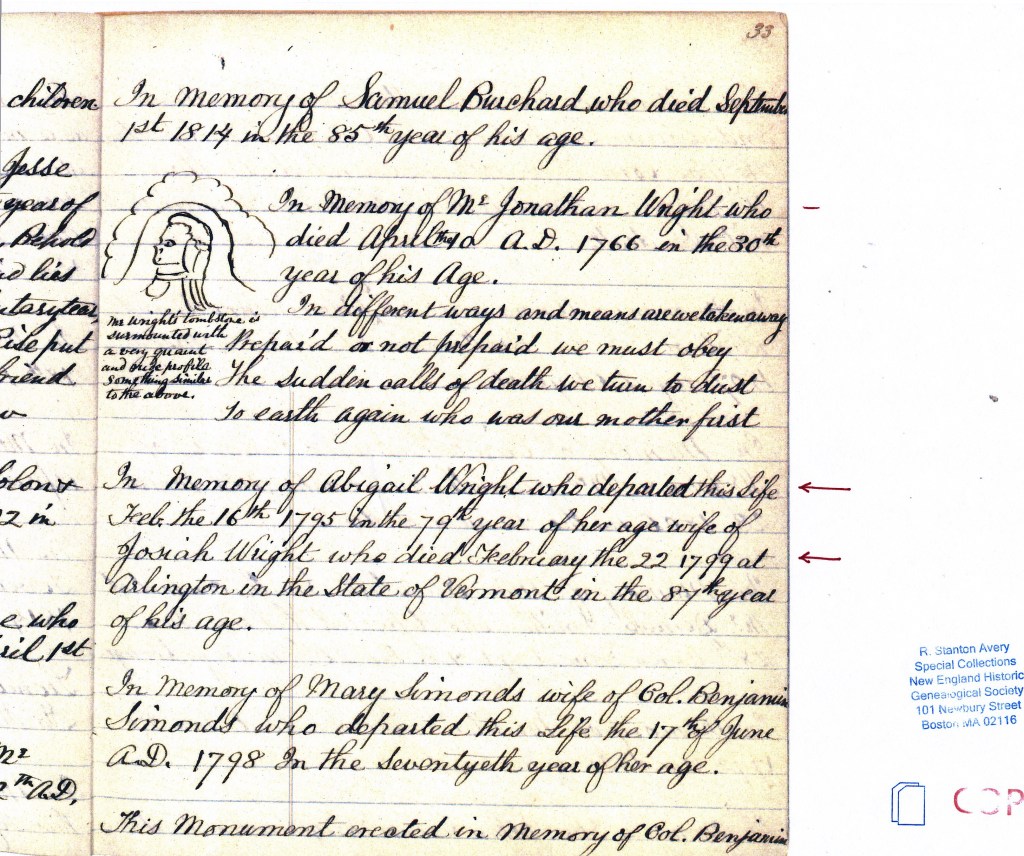 Contrary to published town and family histories, Josiah Wright of Williamstown’s father is Jonathan Wright, and his grandfather is Joseph Wright, son of Thomas Wright the immigrant. Jonathan’s will mentions Josiah and two of Josiah’s sons that were living at the time of Jonathan’s death. Josiah’s birthdate is only three years different than his wife Abigail’s birthdate. Josiah’s age given on Abigail’s grave marker is only two years off of his birthdate.