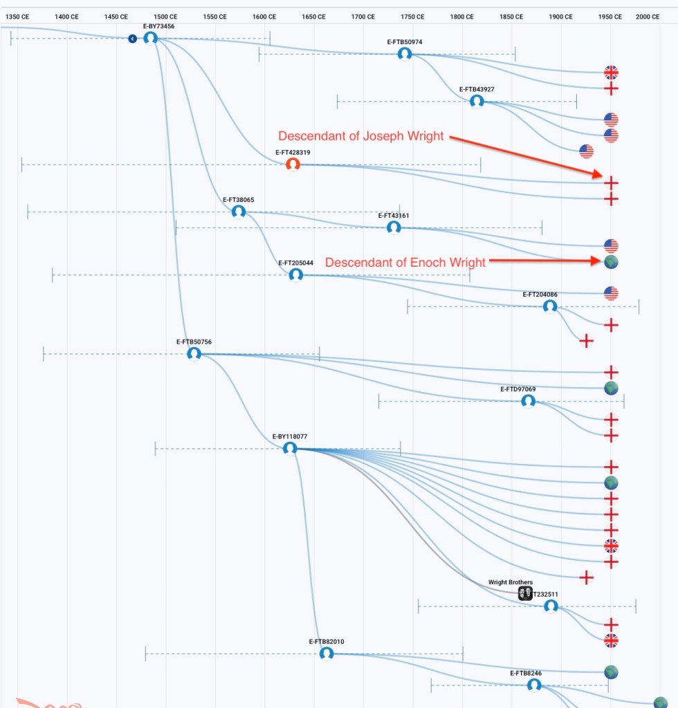 The paper records show that Benjamin Wright’s family descended from Joseph Wright and Enoch Wright’s family descended from Samuel Wright, sons of Thomas the immigrant. Y-DNA validates those conclusions. Enoch Wright and Benjamin Wright both descend from Thomas Wright the immigrant at the first generation but they do not share the same Y-DNA mutation so they must be descended from different sons of Thomas.