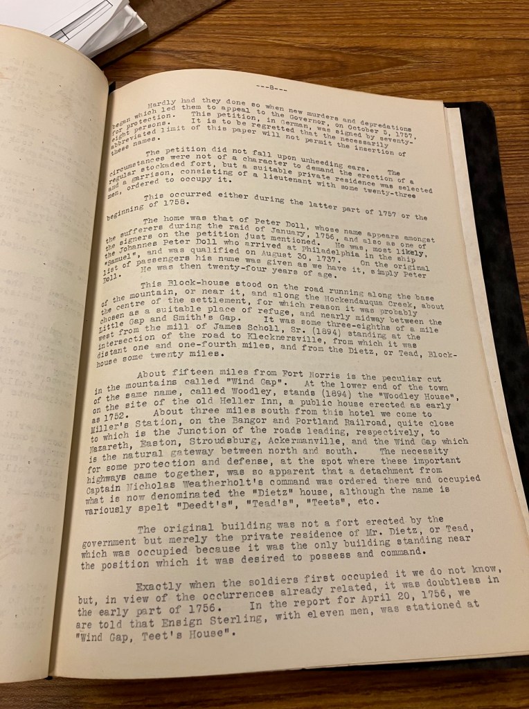 In preparation for the visit we went to the Sigal Historic Society in Easton Massachusetts and met with Howard, one of the library’s researchers. We previously contacted the library and thankfully Howard had already pulled a half dozen highly relevant references to the former site of the Dietz Blockhouse. We spent several hours reading and copying the references and left with a much greater knowledge of Wind Gap and the Dietz fort location.