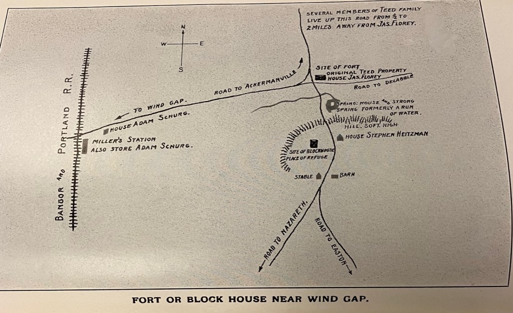 ” The original building was not a fort erected by the Government, but merely a blockhouse, the private residence of Mr. Teed, which was occupied because it was then the only building standing near the position which it was desired to possess. This position was certainly an important one, commanding as it did the roads to and from the Wind Gap, the Forts at and near the present Stroudsburg, Easton and Nazareth From the Wind Gap, proper, it was distant four miles in a direction south slightly east, and from Woodley, the lower end of Wind Gap, some three miles. Its distance from Nazareth was six miles, and from Easton about twelve miles. The Fort, or Blockhouse, stood near the present Miller’s Station on the Bangor and Portland RR, about 350 yards east of the station building…” [3] [4]