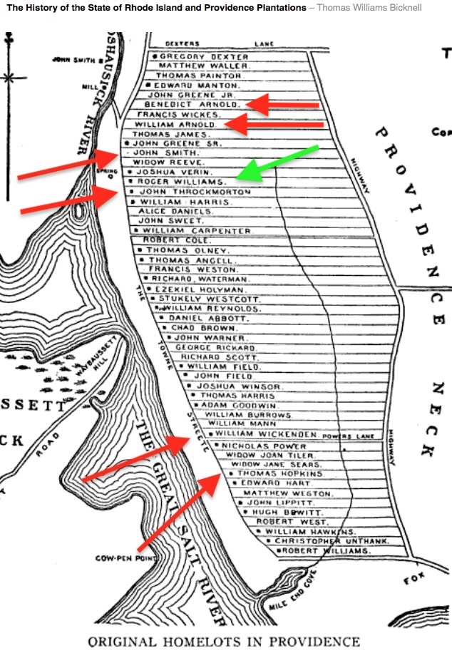 The map below shows lots owned by early settlers 390 years ago. Roger Williams’ lot is next to the spring and is marked by a green arrow. The red arrows mark the lots of our ancestors and our close relations, the Arnolds. John Smith’s lot is the third lot above Roger Williams’ lot and the Arnold’s lots are three and five lots above that. Thomas Hopkins and William Wickenden’s lots are lower down on the map, the 9th and 13th lots above Mile End Cove respectively. Scott family ancestor John Throckmorton’s lot is next to Roger Williams’ lot.