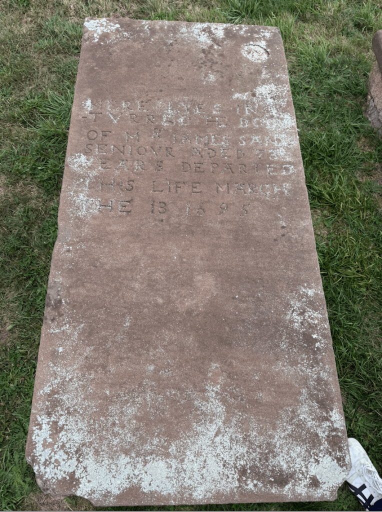 We rode our bikes from Sandy Point to Old Cemetery. At the Old Cemetery we located the raised slab table type marker for James Sands next to his son Edward Sands. After paying our respects and taking photos of the marker we headed back to the port. It started raining lightly so we rode to a restaurant near the ferry and waited out the rain for ½ hour, then got on the ferry.