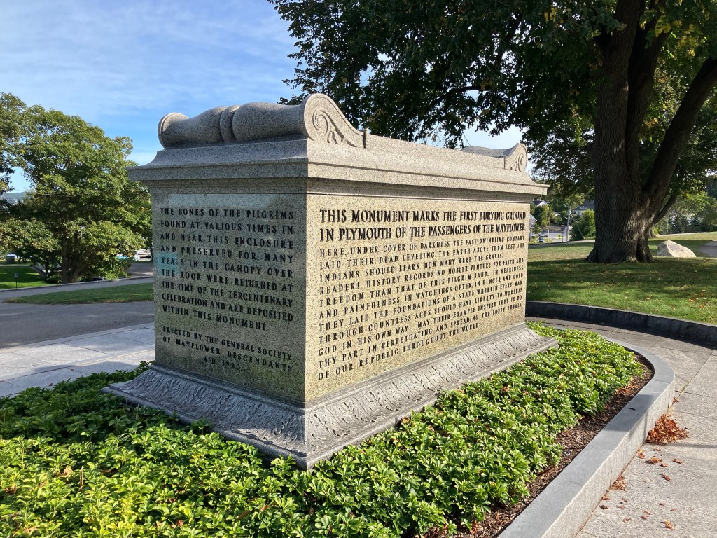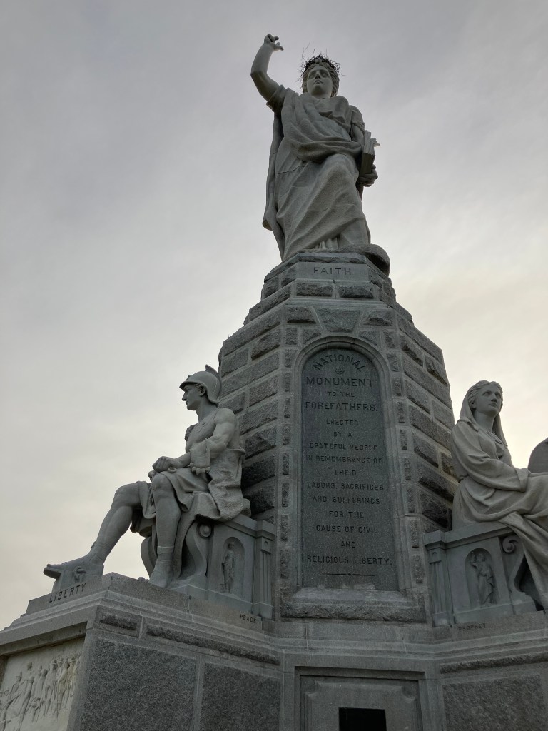 The monument’s inscribed panels include a famous quote by William Bradford,