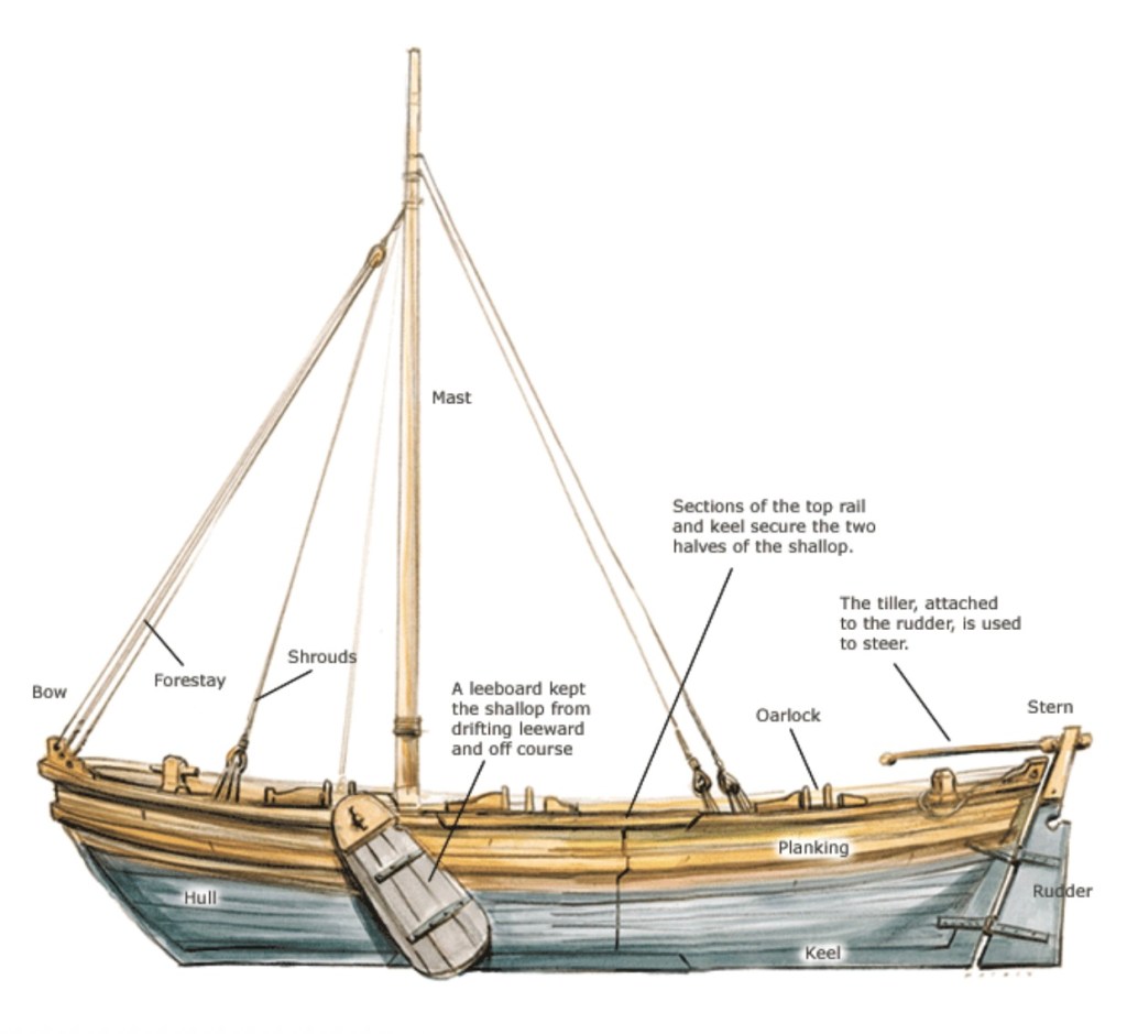 Below is a drawing of what an early 1600’s shallop would have looked like. Note the oarlocks and drop-down keelboard, (one for each side), well suited for navigating shallows and open water. [16]