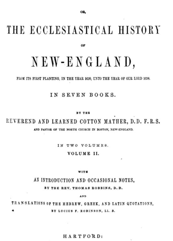 [1] Cotton Mather, D.D. F. R. S., Magnalia Christi Americana; Or, The Ecclesiastical History of New England, v. 2, p. 454-456, London, 1702. Reprint Silus Andrus and Son, Hartford, 1853. https://www.google.com/books/edition/_/iCxKAQAAMAAJ?hl=en&gbpv=1 Last accessed July 2, 2023.